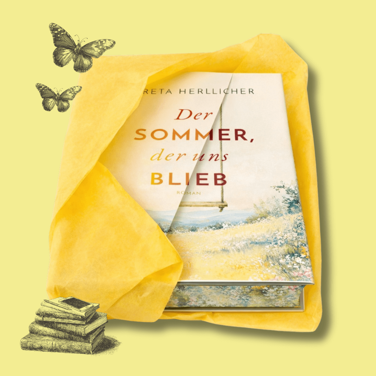 Wie ein Geschenk an dich selbst: Jedes Buch ist behutsam in sonnengelbes Seidenpapier gehüllt. Ein erstes Rascheln, ein kleines Ritual – und der Sommer beginnt schon vor der ersten Seite.